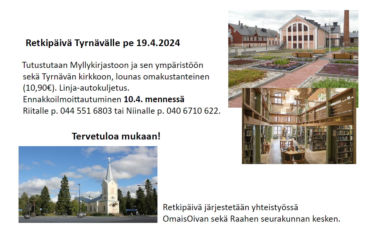 Tule mukaan linja-autoretkelle Tyrnävälle pe 19.4.2024. Tutustutaan Myllykirjastoon ja sen historiaan sekä Tyrnävän kirkkoon. Paikan päällä lounas (omakustanteinen, 10.90€/hlö). Ennakkoilm. 10.4. mennessä Riitalle p. 044 551 6803 tai Niinalle p. 040 6710 622.