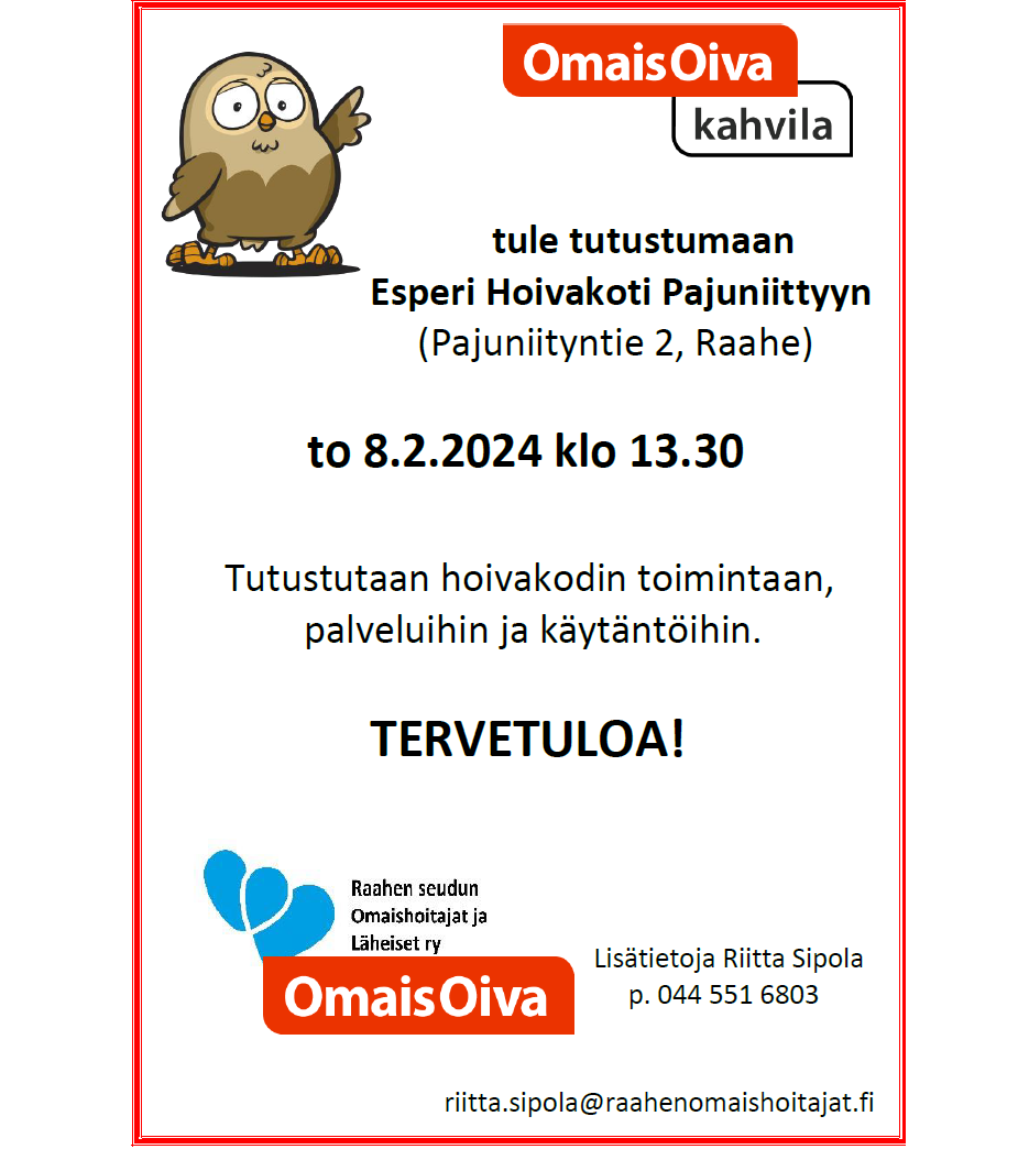 Tutustutaan yhdessä Esperi Hoivakoti Pajuniityn tiloihin ja toimintaan to 8.2.2024 klo 13.30. (Pajuniityntie 2, Raahe).