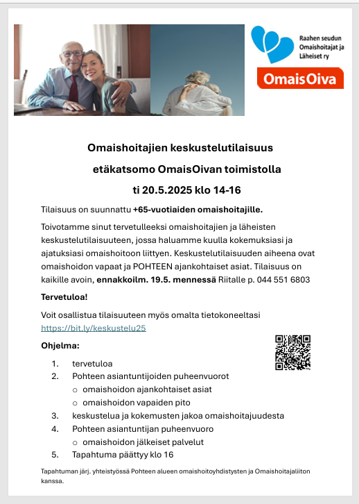 Omaishoitajien keskustelutilaisuus ti 20.5.2025 klo 14-16, etäkatsomo OmaisOivan toimistolla (Kauppakeskus Masto 2.krs Raahe) Tilaisuus on suunnattu +65-vuotiaiden omaishoitajille. Toivotamme sinut tervetulleeksi omaishoitajien ja läheisten keskustelutilaisuuteen, jossa haluamme kuulla kokemuksiasi ja ajatuksiasi omaishoitoon liittyen. Keskustelutilaisuuden aiheena ovat omaishoidon vapaat ja POHTEEN ajankohtaiset… |