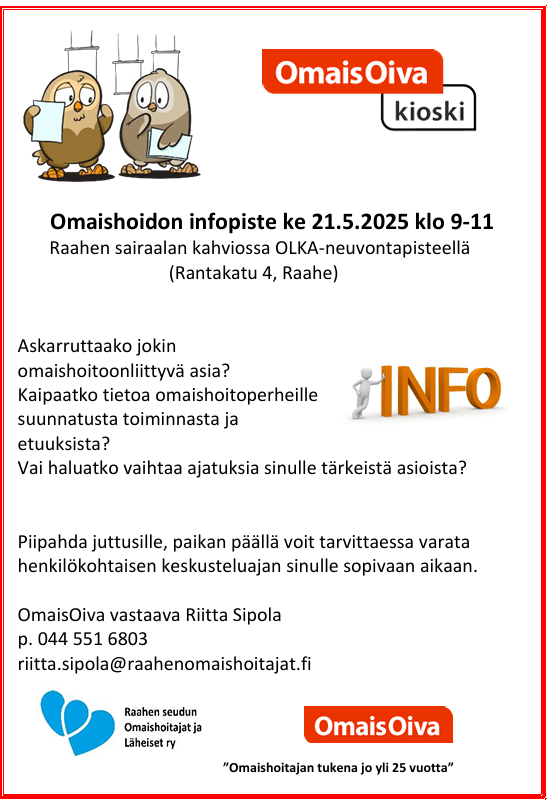 Ke 21.5. klo 9-11 Omaishoidon infopiste Raahen sairaalan kahviossa OLKA-neuvontapisteellä. Piipahda juttusille! |