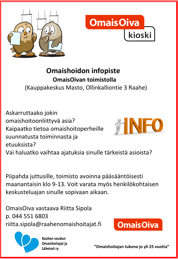 OmaisOiva toimisto avoinna pääsääntöisesti maanantaisin klo 9-13 Kauppakeskus Mastossa 2.krs (Ollinkalliontie 3, Raahe). OmaisOivan työntekijän tavoitat henkilökohtaisesti toimiston aukioloaikaan, muulloin myös puhelimitse ja sähköpostitse. Voit varata henkilökohtaisen neuvonta/keskusteluajan sinulle sopivaan ajankohtaan. Ota rohkeasti yhteyttä, jos kaipaat tietoa, tukea tai kuuntelijaa! Toimistolla myytävänä…
